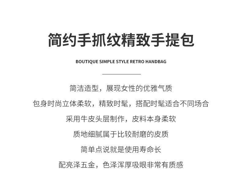 展現(xiàn)自信姿態(tài)這款手提包采用挺拔的版型設計,完美展現(xiàn)你的自信姿態(tài),簡約造型,精致大方!