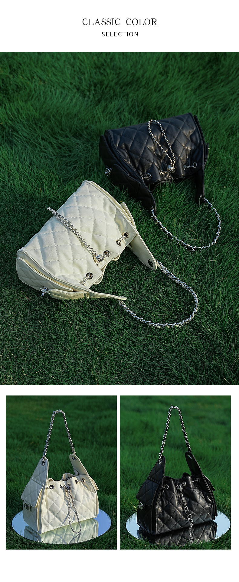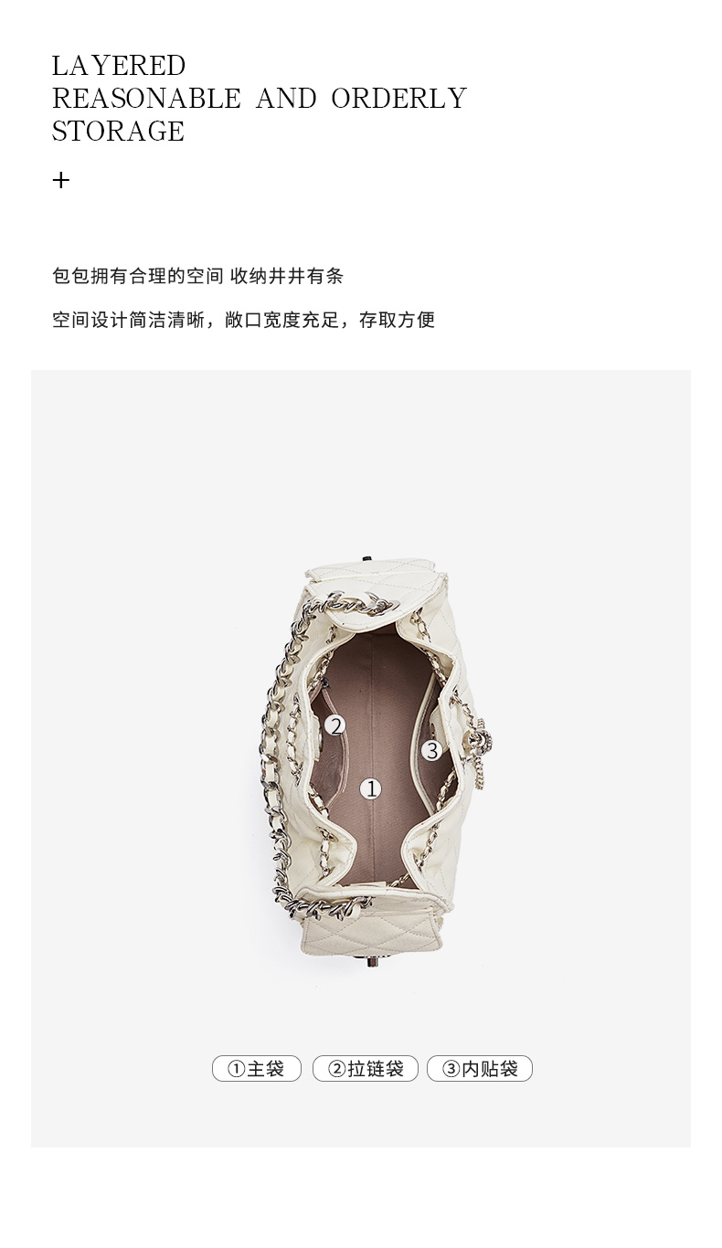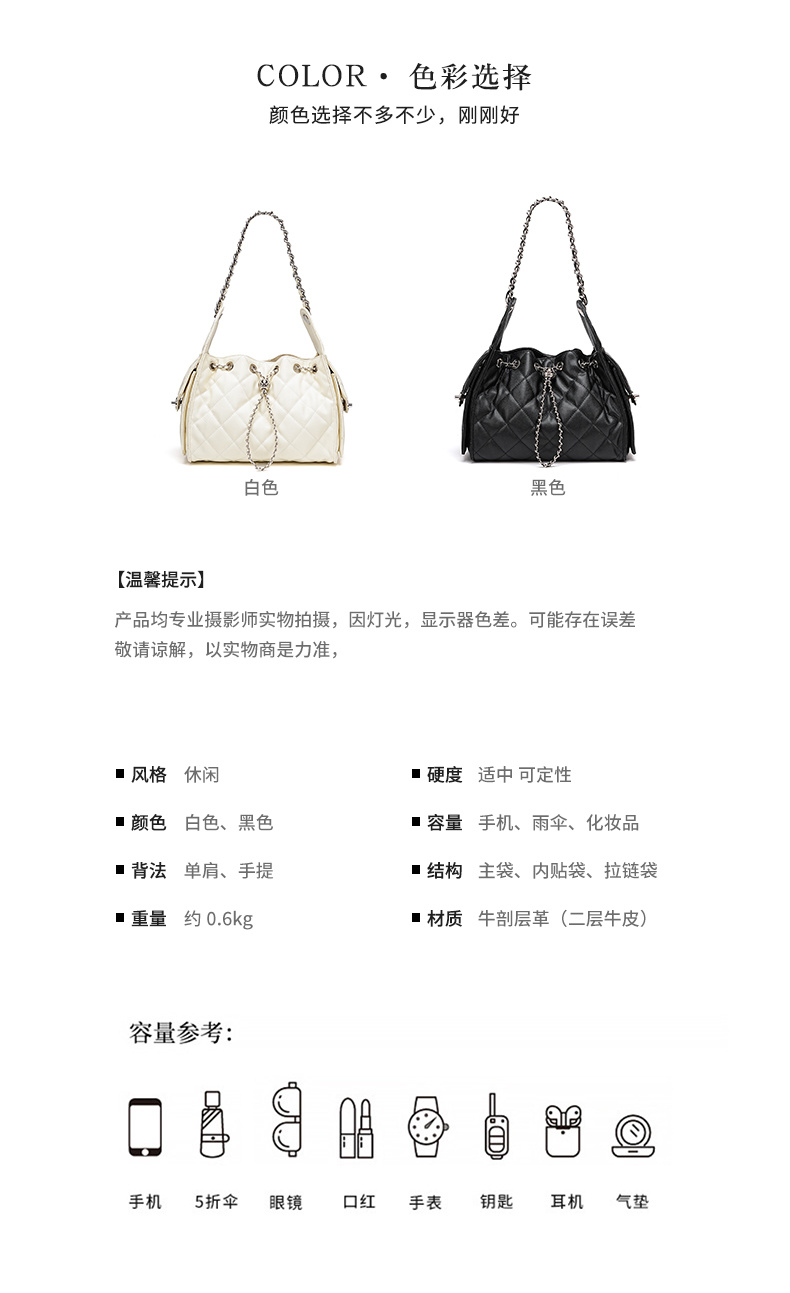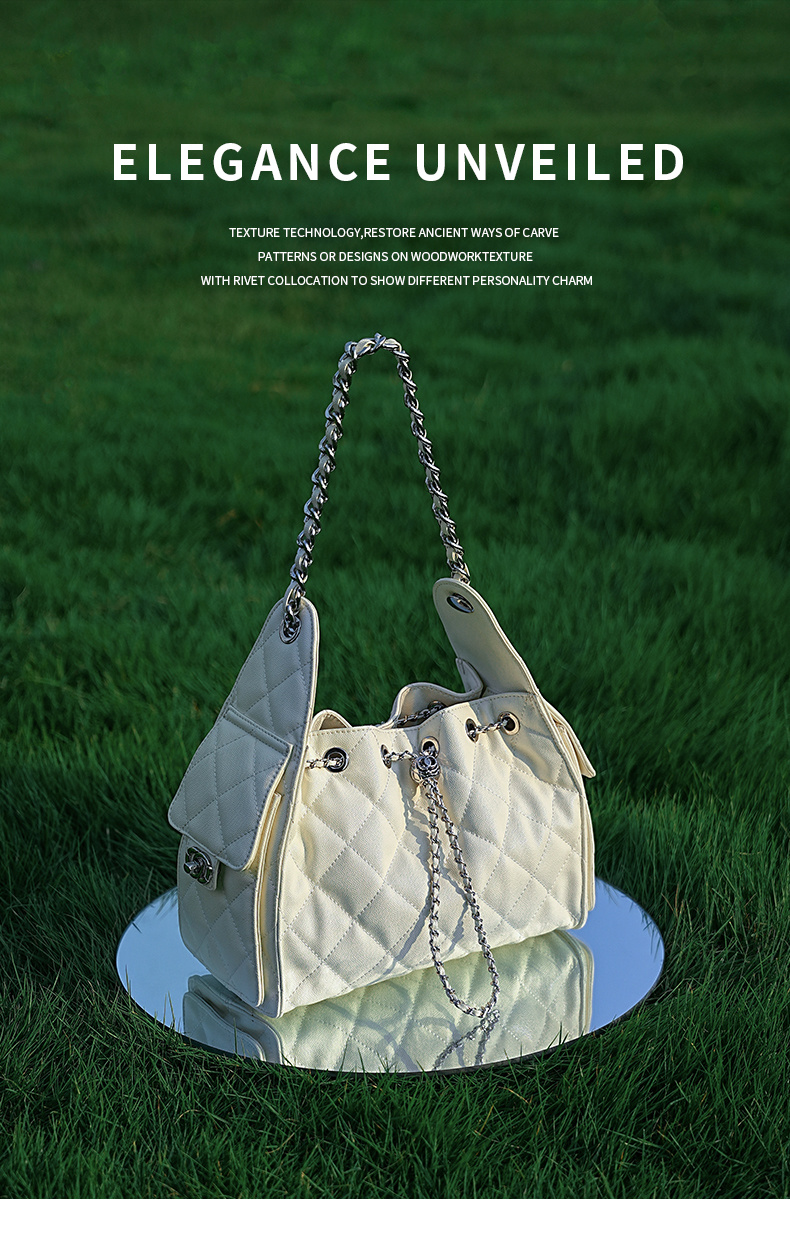 - 商品名稱: 3173-真皮菱格腋下鏈條包百搭大容量魚子醬紋單肩水桶包抽繩包